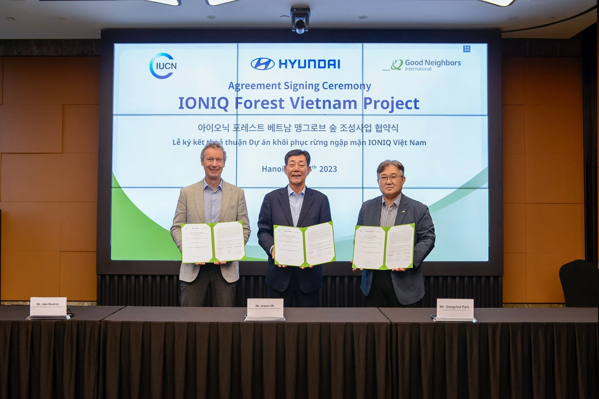 HANOI, October 24, 2023 – IUCN, the International Union for Conservation of Nature, entered a three-year partnership with Hyundai Motor Company and Good Neighbors International (GNI) to restore mangroves in the Mekong Delta with a focus on privately owned shrimp farms.
